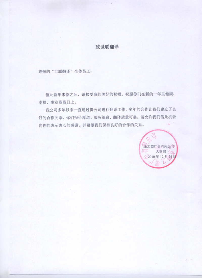 “我司在2014年與貴公司建立合作關系,貴公司的翻譯服務質量高、速度快、態度好,贏得了我司各部門的一致好評。貴司經理工作認真踏實,特此致以誠摯的感謝!”