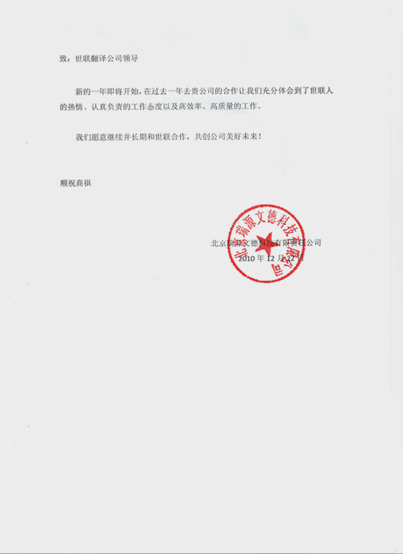 新的一年即將開始,在過去一年去貴公司的合作讓我們充分體會到了世聯人的熱情、認真負責的工作態度以及高效率、高質量的丁作。