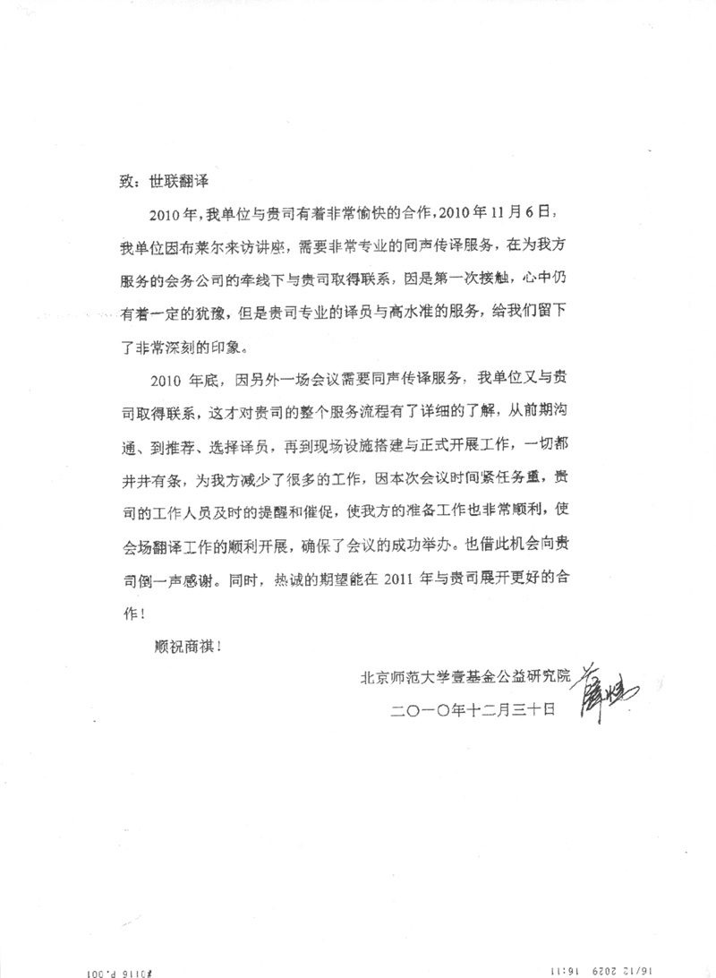 “貴公司與我社對翻譯項目進行了幾次詳細的會談,期間公司負責人和廖小姐還親自來我社拜訪,對待工作熱情,專業度高,我們雙方達成了很好的共識。對貴公司的服務給予好評!”
