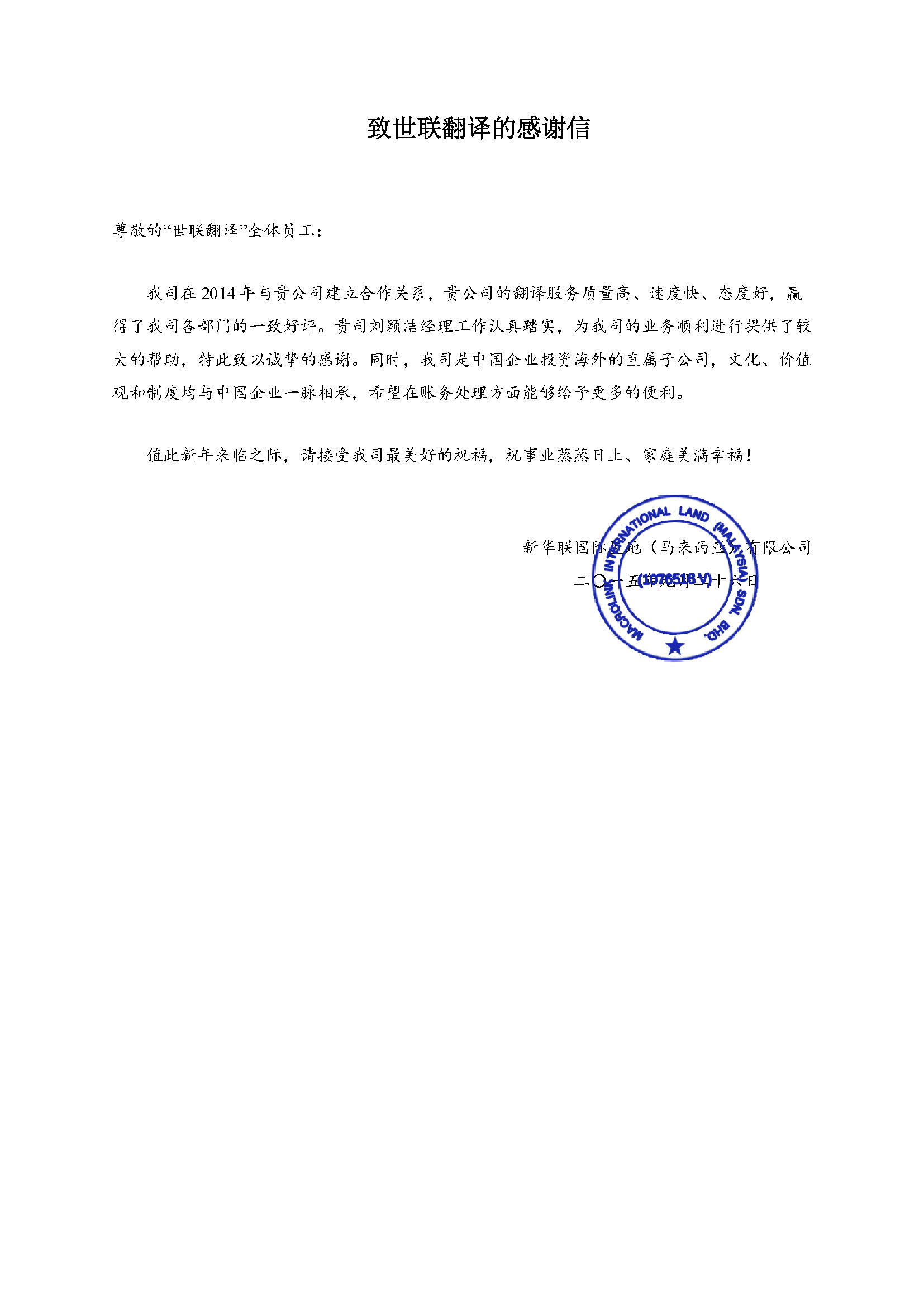“我司在2014年與貴公司建立合作關(guān)系,貴公司的翻譯服務(wù)質(zhì)量高、速度快、態(tài)度好,贏得了我司各部門的一致好評。貴司經(jīng)理工作認(rèn)真踏實(shí),特此致以誠摯的感謝!”