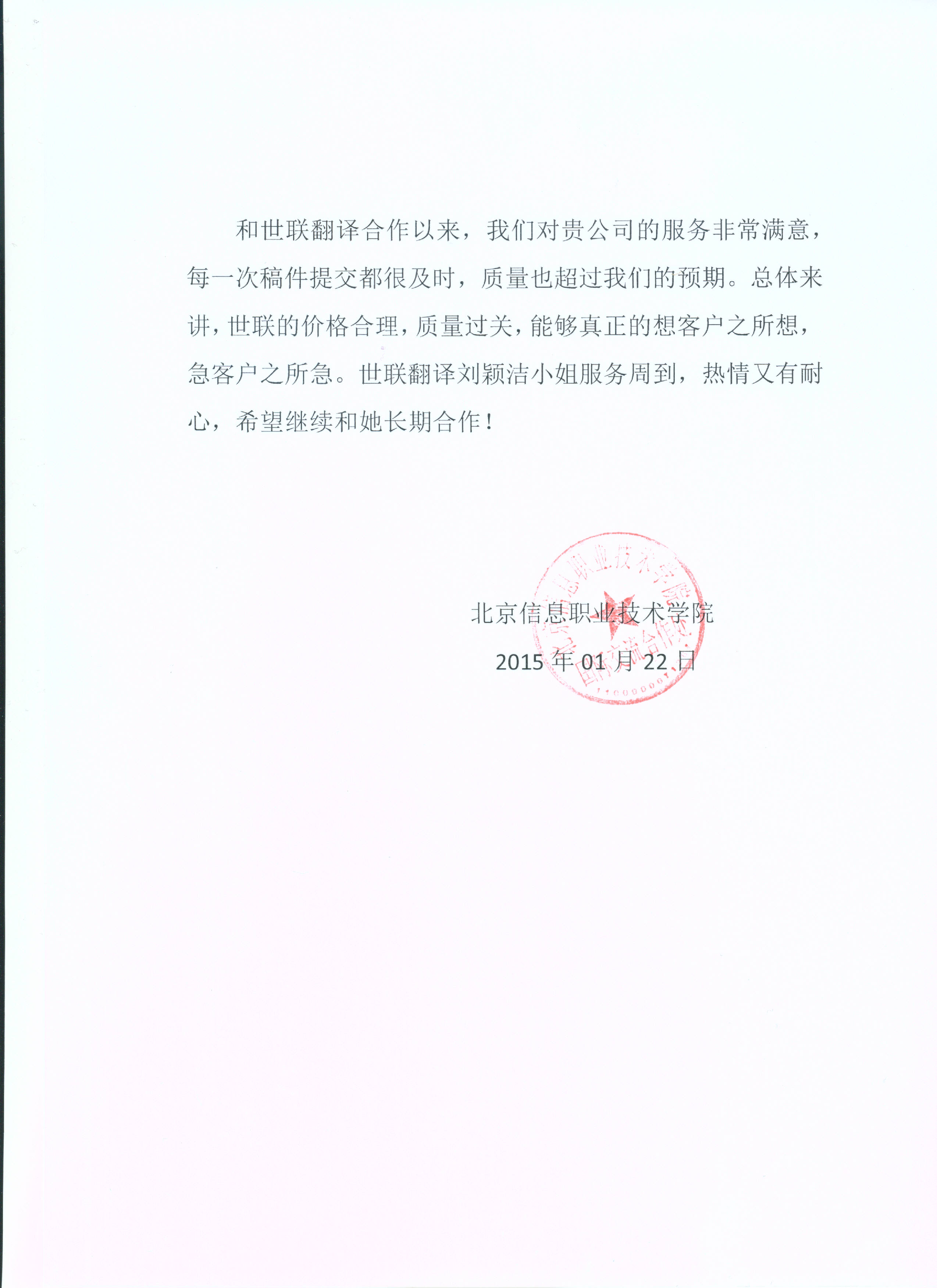 • “我司在2014年與貴公司建立合作關系,貴公司的翻譯服務質量高、速度快、態度好,贏得了我司各部門的一致好評。貴司經理工作認真踏實,特此致以誠摯的感謝!”