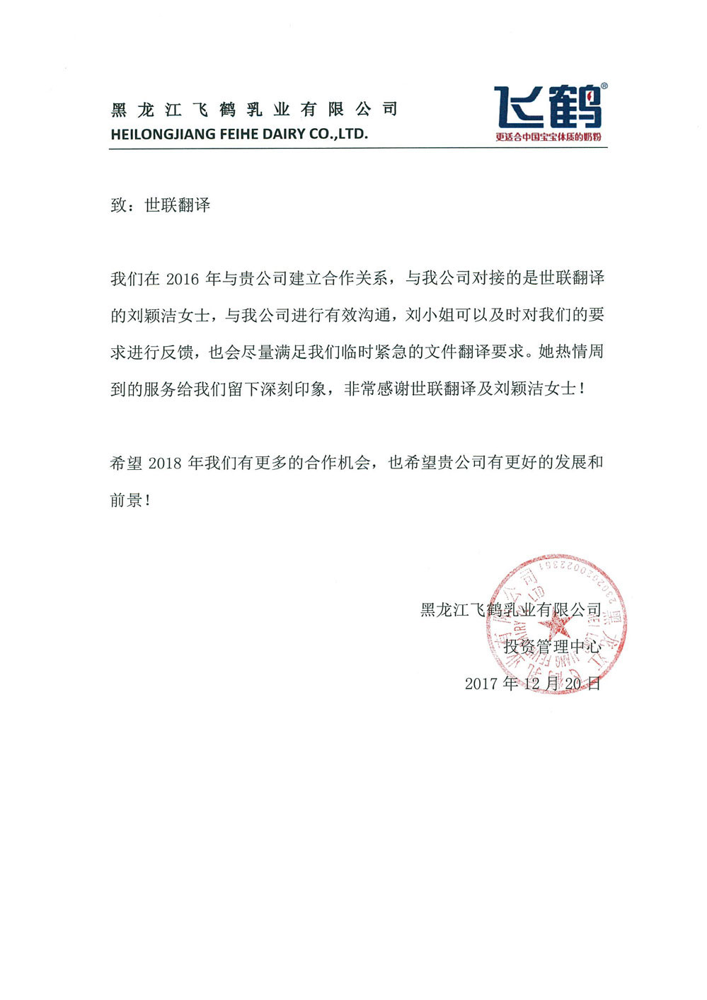 黑龍江飛鶴乳業有限公司致世聯翻譯的一封信